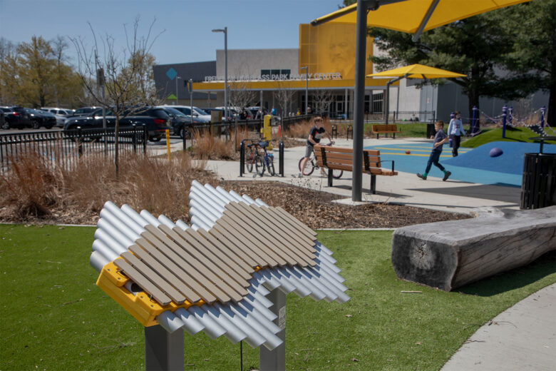 This project aimed to create and blend outdoor spaces that fit well with the new Frederick Douglass Park Family Center building, designed by Meticulous, ensuring users could safely and fully enjoy the entire site. This was done by creating a multi-use outdoor play area, which included new playground equipment and surfacing, a picnic shelter, an outdoor fitness area, and improved parking areas. The Shrewsberry Landscape Architecture team was responsible for designing surface grading and drainage of landscape and play areas, design and detailing of hardscape areas, including decorative paving building entries and outdoor gathering areas, landscape plantings, ensuring accessible outdoor use areas, including the playground, creating rain gardens, tree preservation, and site furnishing selection. The playground’s unique features include permeable safety surfacing, enabling the conservation of many sizeable mature shade trees, and repurposing several trees that needed to be removed as unique sitting elements.